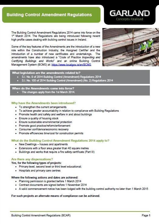 Garland have prepared a guide on the Building Control (Amendment) Regulations 2014 which came into force in March 2014. The new BCAR legislation has important implications for the compliance and implementation of building design and construction.