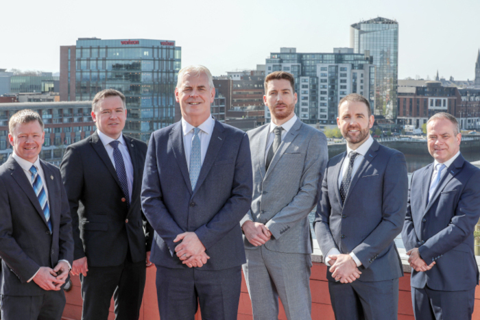 Simon, Chris, Tommy and Ciarán are pictured with Kevin Rudden (CEO + Director) and Brian Lahiff (Director), with both our Limerick Office and the recently compelted 1BQ project in the background.