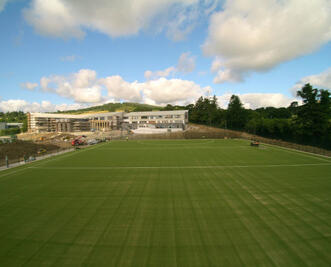 The project involved the construction of a new 750 pupil Post Primary School for the newly formed Temple Carrig Secondary School over 3 storeys. The site is located on the Blacklion Road in Greytsones adjacent to an existing Primary School Campus and is on a steeply sloping site. Due to the nature of the site, the building is stepped over a number of levels. Necessitating the requirement for significant quantity of reinforced concrete retaining walls as part of the buildings structure. In addition to the typical blockworks and concrete construction, there are elements of exposed glulam installation which were bespoke designed and manufactured for the school. The project included the construction of a temporary school building and associated works to facilitate a September 2014 enrolment, whilst works to the permanent building were maintained. As part of the works, there was a full size all-weather floodlit hockey pitch constructed within the school’s grounds. Furthermore, the external landscape design incorporates significant external learning provision.