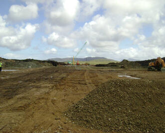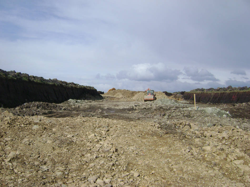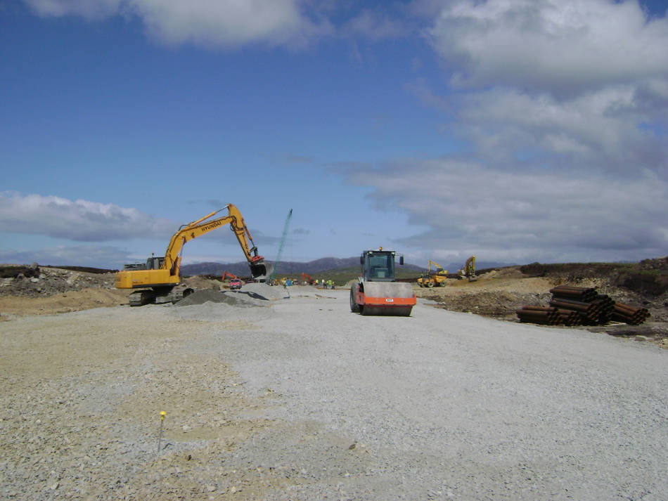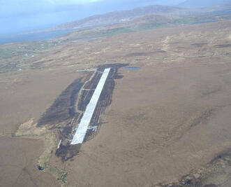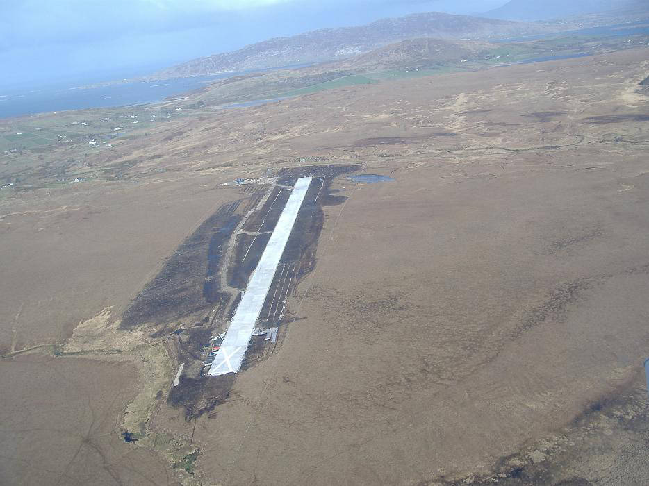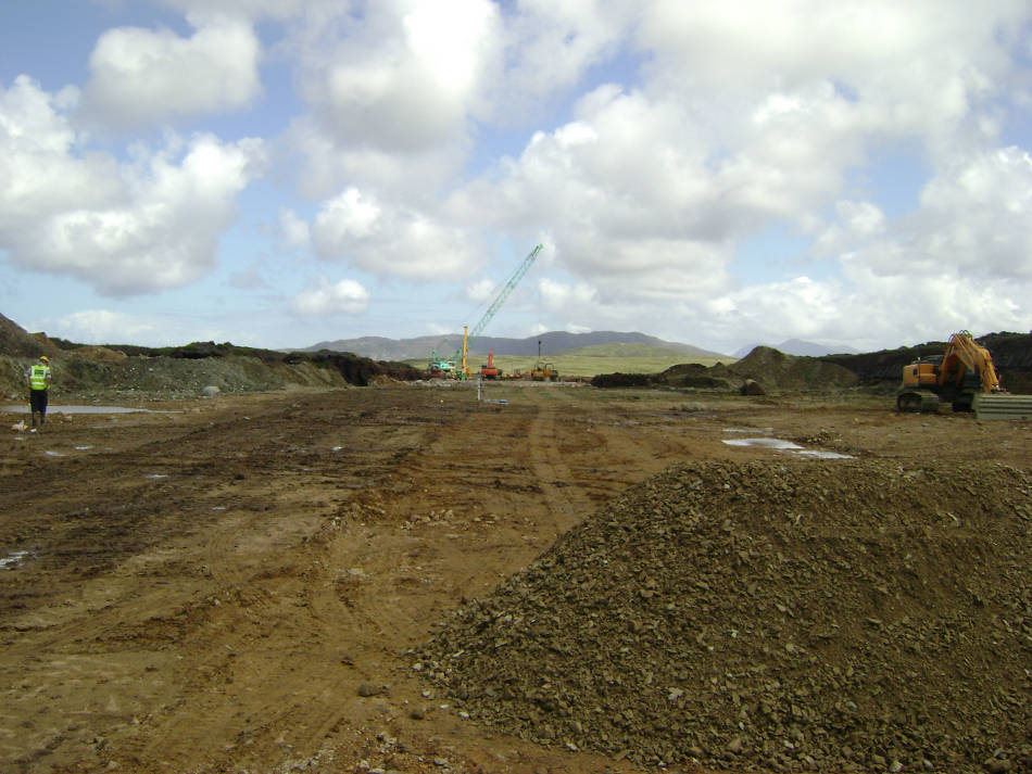 The project involved the construction of a runway (550m x 20m wide) and associated shoulder, encompassing a total airstrip of 3.6 HA, (610m x 60m). The site, almost rectangular in shape, comprised of blanket bog and rock at varying depths underlying the bog. It was necessary to excavate down to bedrock in order to provide a suitable foundation for the airstrip. Piled foundations were installed at either end of the airstrip due to the varying rock profiles. All excavated material, both peat and rock, was retained for use on site. A lightweight PVC drainage system, partly suspended, was installed to take surface water runoff to an adjacent water course. During the course of the works, an outline planning permission was prepared and submitted for a Terminal Building. The Terminal Building with a floor area of 69 m2 incorporated an Air Traffic Viewing Platform and 50 space car park with access roadway. The airstrip is a category 1B aerodrome with a runway in the north east/south west direction.