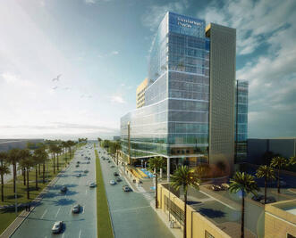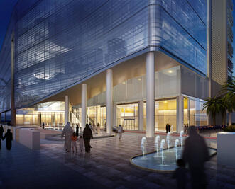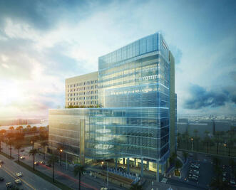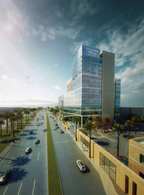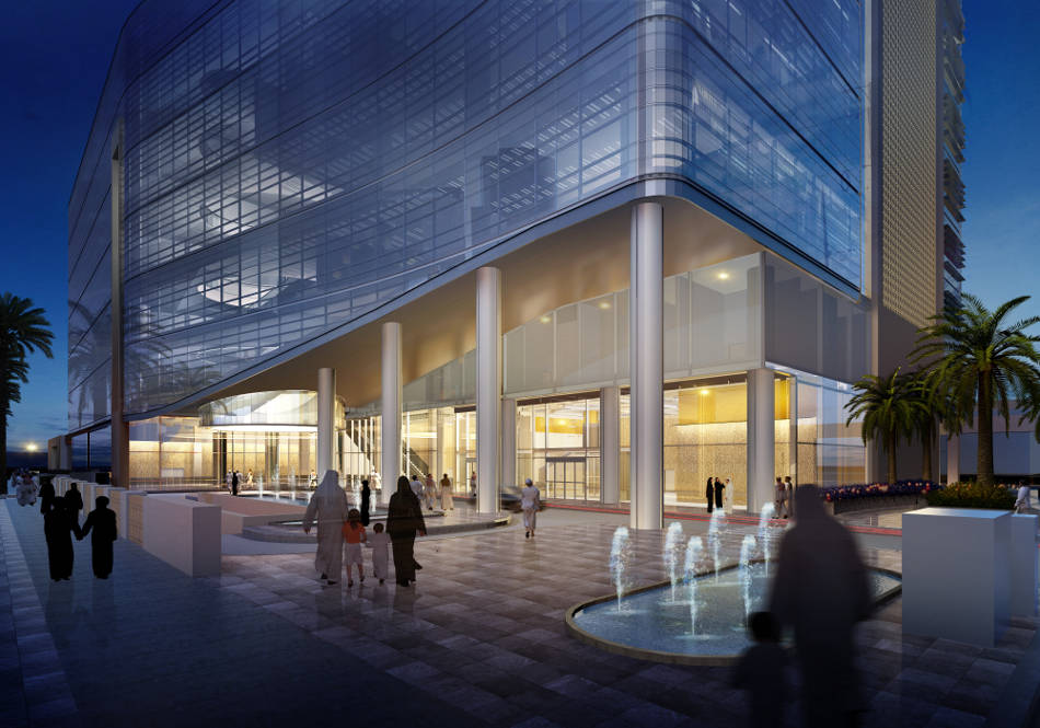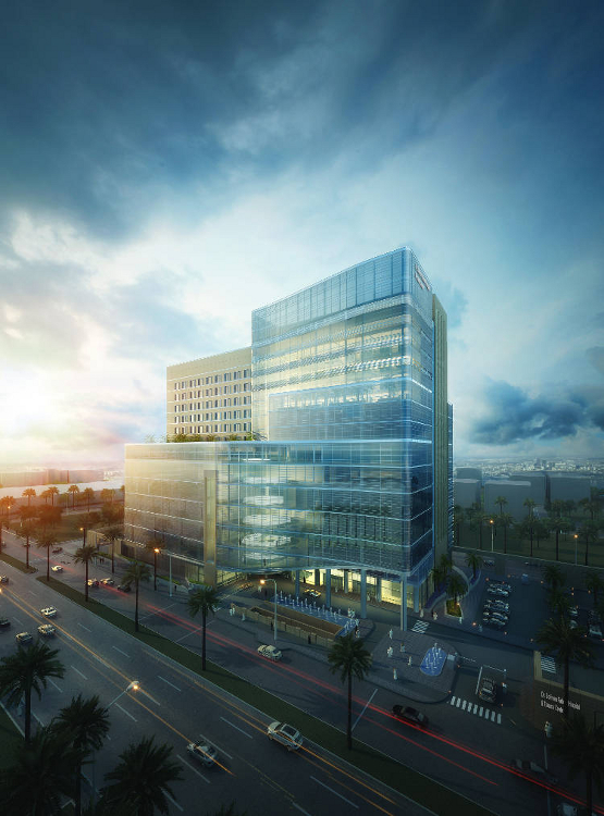 The facility will comprise 15 floors over one basement level and currently has a total floor area of 60,000 m2. This area includes a total of approximately 36,223 m2 of clinical/medical space, which houses the 75 clinical examination rooms and 220 no. beds which are provided in private and semi- private rooms. The hospital is also designed to cater for VIP’s and Royalty, where the uppermost floor dedicated to and is directly accessed through separate private entrances lobbies on ground floor.