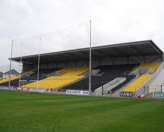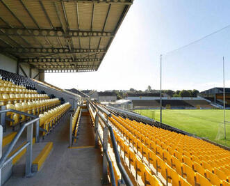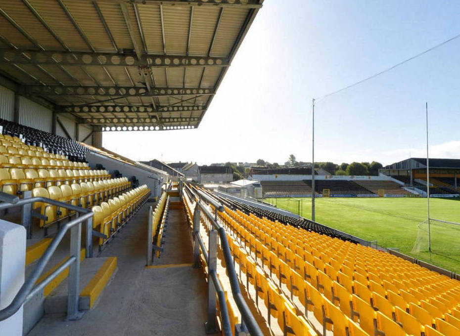 The cantilever roof of the stand is supported by a vertical and diagonal structural steel frame system which is fixed to reinforced concrete wall panels. The deck is cast insitu reinforced concrete supported on reinforced concrete walls. All concrete is fare faced finished.