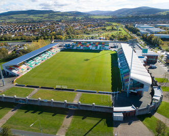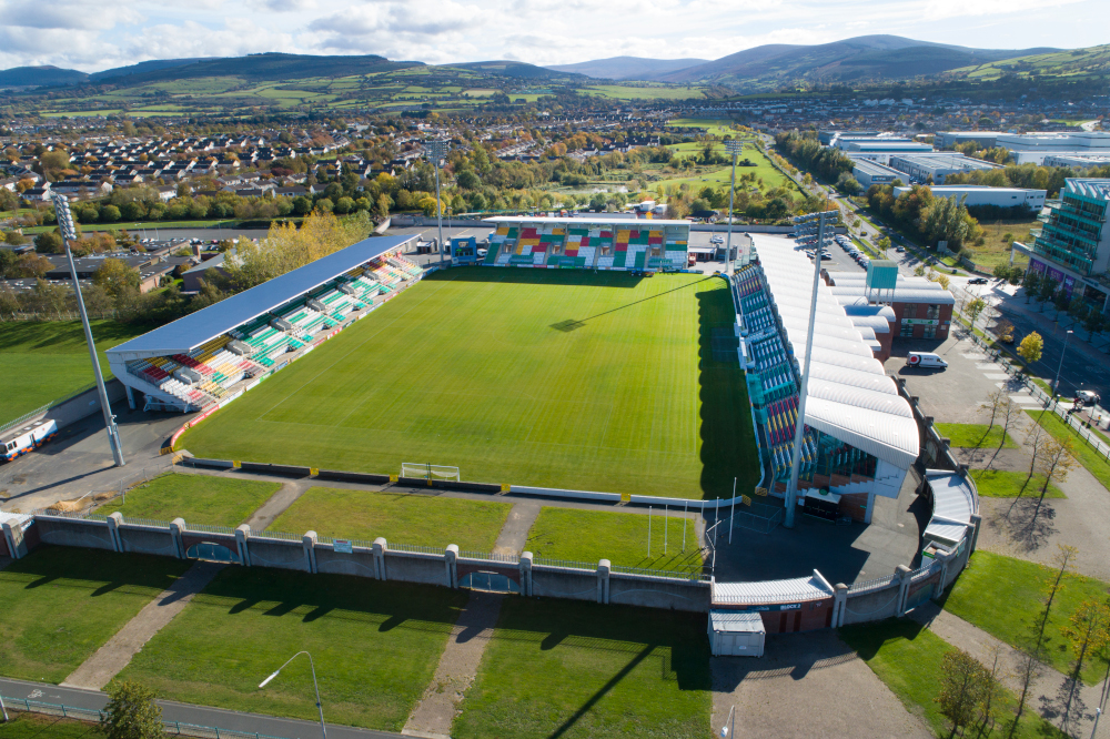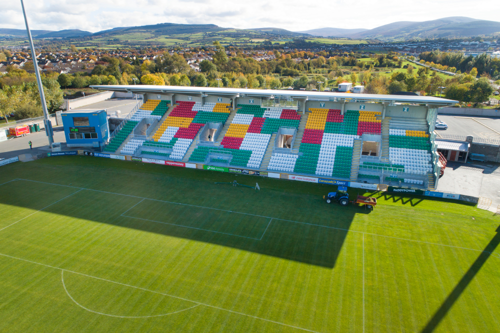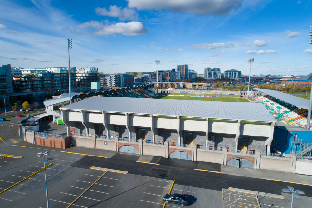 This project for South Dublin County Council provided a third, 2160 capacity stand for the stadium for Shamrock Rover’s football club. This stand is constructed from precast concrete rafters with structural steel bracing and purlins support a metal deck roof to match the existing stands. A structural steel television gantry is hung from rafters. Perimeter works included a new south entrance, toilet/concession areas below the stand and reinstatement of external paving.